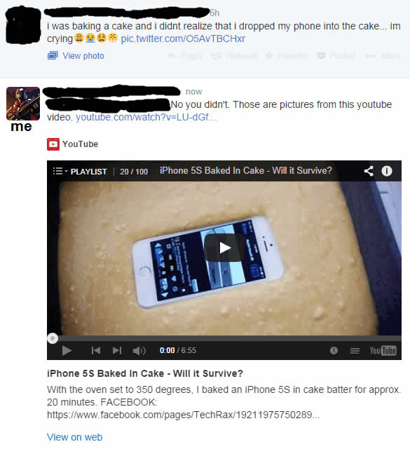 令人驚訝的是,有很多人以為只要把熱門影片截圖,就可以聲稱那件事發生在他們身上。這個人分享了一張照片,聲稱她烘焙時手機不小心掉進了蛋糕麵糊裡。
