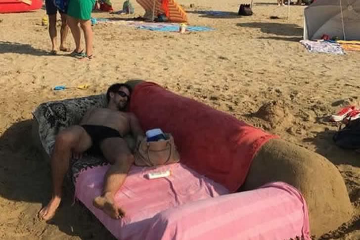 아무래도 소파가 너무 그리웠는지, 그는 이 모래 소파를 만들고는 마치 집에 있는 것처럼 그 위에 누워 잠들어 버렸습니다. 이제 필요한 건 TV 리모컨과 간식 트레이뿐이네요. 최고의 해변 휴가를 계획할 사람을 고른다면, 이 남자가 첫 번째 목록에 있어야 합니다.