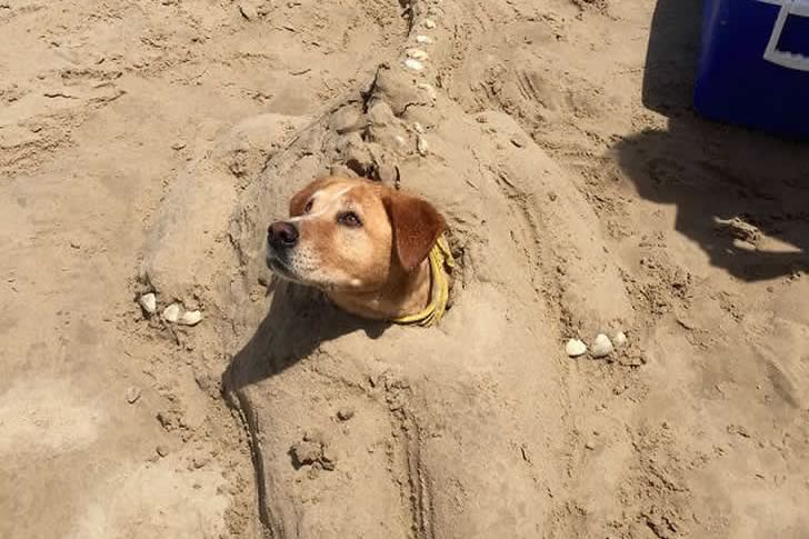 이 착한 강아지는 인내심에 대한 훈장을 받아 마땅합니다. 모래 속에 머리만 내밀고 파묻혀 있고, 나머지 몸은 공룡의 몸으로 예술적으로 조각되어 있습니다.