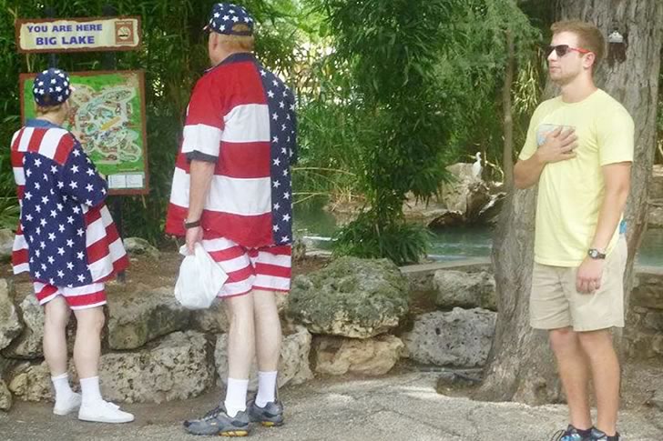 그래도 우리는 그곳에 서서 국기에 경례하는 애국적인 한 사람에게 찬사를 보내야 합니다. 바라건대, 이 사람은 국기를 입은 관광객들의 눈에 띄지 않았기를 바랍니다. 그들은 그의 행동을 재미있게 여기지 않을 수도 있으니까요. 자유와 용기를 소중히 여기는 국가의 정신을 기리며, 진정으로 중요한 가치들을 지켜나가는 것을 기억합시다.