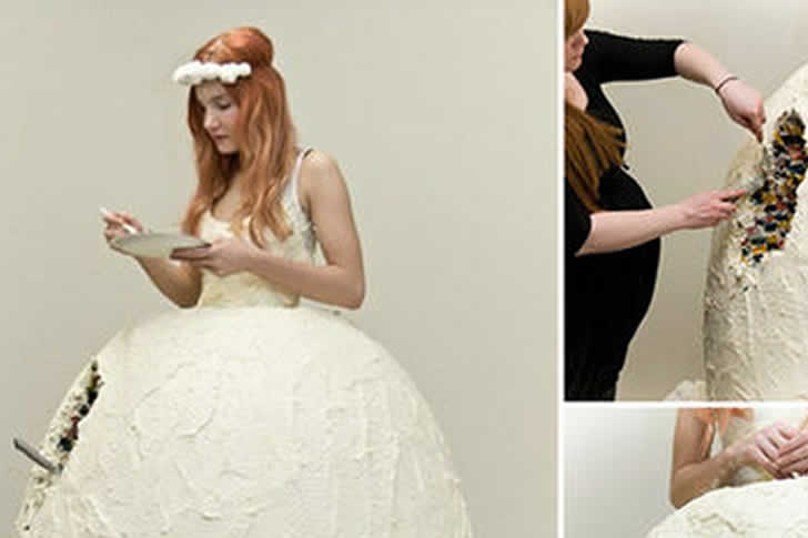 蛋糕、蛋糕、蛋糕、蛋糕——沒錯,看到這位新娘的婚紗時,腦海中立刻浮現的就是這些。層層疊疊、荷葉邊和裙襬,活脫脫就是一座高聳的結婚蛋糕,她的禮服搶盡了風頭,讓每個人都忍不住多看兩眼。