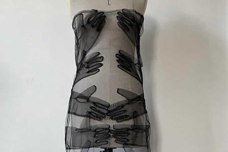 這件洋裝看起來就像有人問:「一件衣服上能塞進多少個尷尬的手勢?」而設計師自信地回答:「沒錯,就是這麼多。」手套漂浮在薄紗上,像一群幽靈般的人群,完全忘了個人空間。