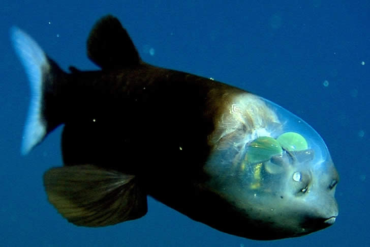 Il pesce dagli occhi a barile è un piccolo abitante argenteo degli abissi, con una testa a forma di cupola completamente trasparente che assomiglia a un casco di plastica trasparente. I suoi occhi tubolari, a forma di barile, puntano direttamente verso l’alto all’interno di quel cranio trasparente. Si muove nella zona crepuscolare oscura dell’Oceano Pacifico, solitamente tra i 600 e i 790 metri sotto la superficie.