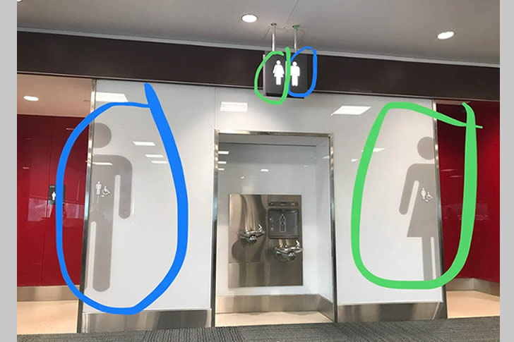 6. 剛才看到有人在多倫多皮爾遜機場走錯了廁所。他當時在看上面的標誌。