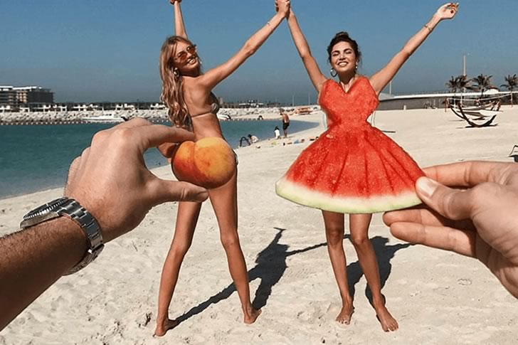 Deux femmes prennent des poses dramatiques sur la plage tandis que des mains géantes au premier plan les « habillent » : l’une reçoit un bas de bikini pêche, l’autre une robe pastèque entière. L’illusion d’optique est si parfaite qu’on dirait que Mère Nature elle-même a décidé de jouer les stylistes avec des produits de supermarché.