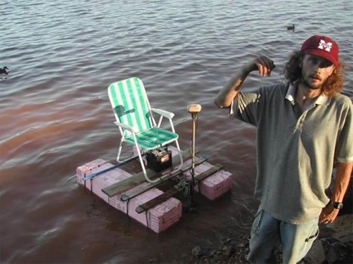 Behold the pinnacle of human innovation: a beach chair, ingeniously attached to two planks and equipped with an outboard motor, floating like a throne on the water. This masterpiece of makeshift maritime engineering is the brainchild of a man who clearly refuses to accept the mundane boundaries of beach furniture.