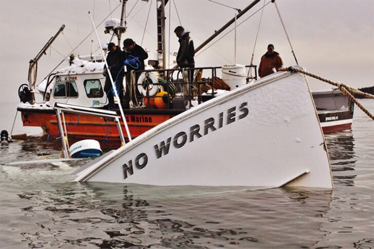 Behind this slowly sinking vessel, a ship looms, its crew bustling about, preparing for an aquatic rescue mission. The contrast is almost cinematic—the carefree ‘No Worries’ boat in its unintended underwater descent, and the pragmatic ship’s crew, all business, ready to salvage the day. This gives ‘going under’ a whole new meaning!