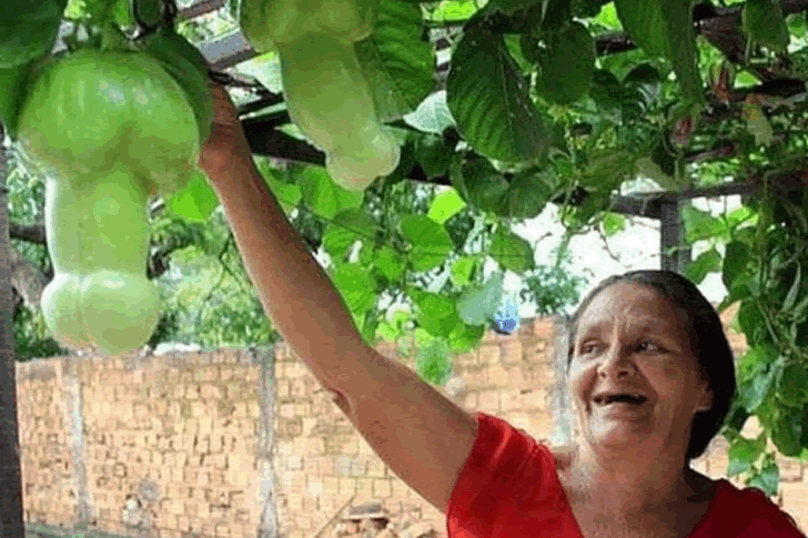 Deze lieve oma laat vol trots haar fruitboom zien. Alleen iemand met een erg vieze fantasie zou iets anders zien dan sappig fruit. Wat dacht jij? Misschien dacht je wel aan iets heel anders?