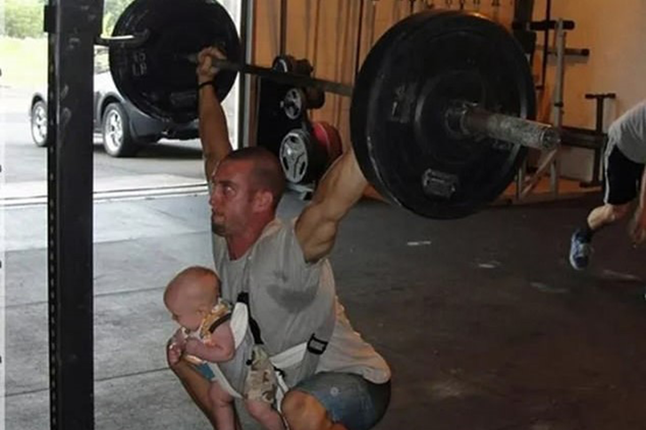 Dieser Vater beweist: Elternzeit heißt nicht, aufs Training zu verzichten! Allerdings sollte man vielleicht zweimal überlegen, bevor man sein Baby als zusätzliches Gewicht benutzt. Während das Kleine fragend in die Kamera blickt (“Papa, was genau soll das?”), balanciert der stolze Vater schwere Hanteln über beiden Köpfen.