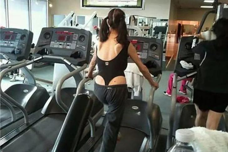 Dieses Outfit beweist: Selbstbewusstsein kennt keine Dresscode-Grenzen! Während die meisten im Gym auf Funktionalität setzen, hat diese Dame sich für einen Look entschieden, der eher an einen 80er-Jahre-Aerobic-Kurs erinnert. Der ultratiefe Hosenbund trifft auf den hochgezogenen Gymnastikanzug – ein mutiger Stilmix!