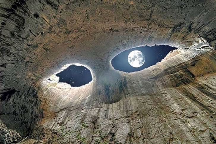 At first glance, this image looks like a mythical creature silently watching from the shadows, with piercing eyes glowing in the night. But in reality, it’s an extraordinary natural formation: two massive openings in a cave ceiling aligned just perfectly with the full moon and stars beyond. The symmetry and positioning create an illusion so surreal that it feels like the Earth itself has come alive to observe the universe.