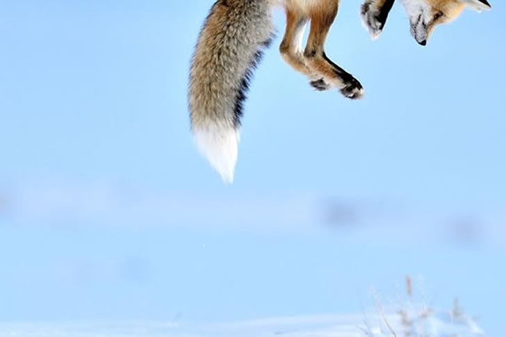 What makes this photo so captivating is its precise timing. The photographer managed to freeze a fleeting second where everything aligns: the leap, the balance, the expression. It’s a silent yet intense moment that reveals the agility and instinct of this elusive animal. The clean composition and pale backdrop help the viewer focus entirely on the fox’s motion, turning what could have been a simple wildlife scene into a dramatic, almost surreal visual story.