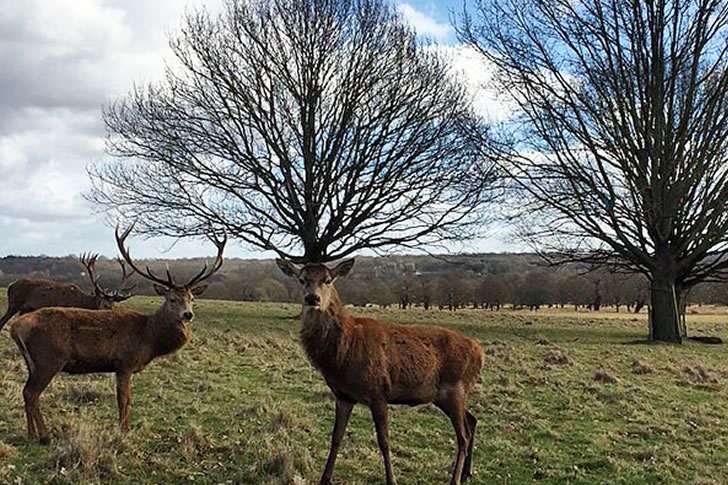 At first glance, this serene landscape appears ordinary—until you notice the majestic deer whose antlers seem to defy reality. Perfectly framed beneath a bare-branched tree, the animal looks like it has sprouted an impossibly massive crown of twigs and branches. It’s not magic, but a flawless fusion of perspective and timing, transforming a typical wildlife scene into something whimsical and surreal.