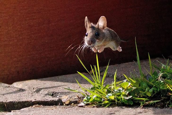 This remarkable photo captures a mouse caught in the middle of a leap, suspended gracefully above the ground. The timing is so perfect that the little creature appears to be flying, its tiny feet tucked in and ears alert, frozen in mid-motion. Against the backdrop of pavement and blades of grass, the moment looks both ordinary and magical—a fleeting instant that would be missed if not captured at just the right time.