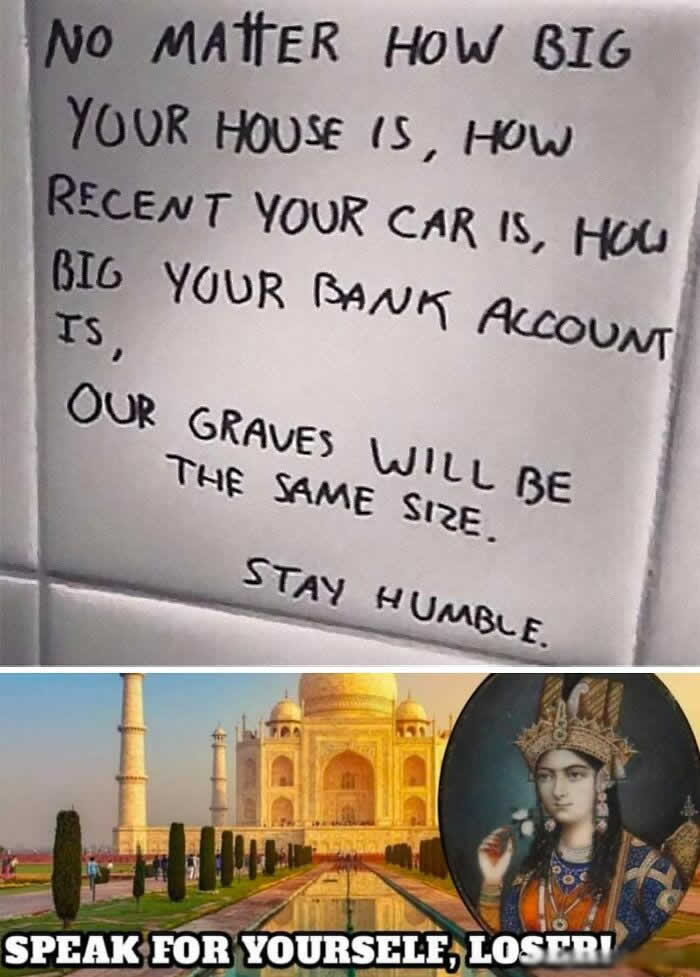 圖片中的笑話或引言暗示每個人死後都會有一個「簡樸的安息之地」,但顯然在這個案例中並非如此——有些人擁有極其精緻且昂貴的陵墓。幽默感來自於簡樸安息之地的概念與像泰姬瑪哈陵這類奢華陵墓現實之間的對比。