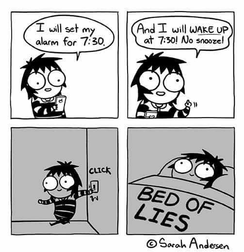 這則漫畫是一個引起共鳴的「床 vs. 鬧鐘」迷因。在前兩個分鏡中,角色自信地將鬧鐘設定在 7:30,並承諾要準時起床不貪睡——超級有決心。在第三個分鏡中,他們去睡覺了……而在最後一個分鏡中,他們完全躺在床上,這張床還被幽默地標註為「謊言之床」
