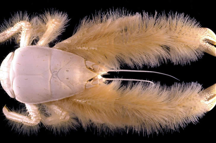 Il granchio yeti è uno strano crostaceo di profondità con un corpo bianco spettrale e una lunga, ispida “pelliccia” giallastra che gli copre le chele e le zampe, facendolo sembrare un minuscolo abominio delle nevi. Scoperto nel 2005 vicino a sorgenti idrotermali sulla dorsale Pacifico-Antartica, vive nell’oscurità più totale a oltre 7.000 piedi sotto il livello del mare.
