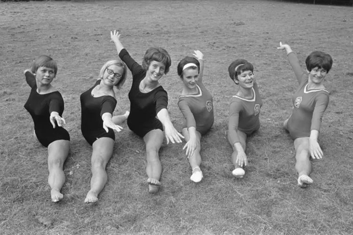 Interessanterweise hat sich die Landschaft der Haarpflege und -stilisierung seit damals dramatisch entwickelt. In der heutigen lässigen Umgebung ist es üblich, das Haar practicalerweise in eine Pferdeschwanzfrisur zu binden, sei es für eine sportliche Aktivität oder einen Workout im Fitnessstudio. Die Frauen, die in diesem faszinierenden Foto verewigt sind, haben jedoch einen völlig anderen Geist angenommen. Mit beispielloser Hingabe haben sie sich verpflichtet, ihre sorgfältig gestalteten Aufstriche aufrechtzuerhalten, auch wenn sie dynamische Sprünge ausführt und sich auf Turnwettkämpfe vorbereitet. Dieses bemerkenswerte Engagement für den Stil, auch in der Gegenwart körperlicher Anstrengung, fängt die einzigartige Seele dieser Ära ein und bezeugt von der anhaltenden Anziehungskraft der Mode der 60er Jahre.