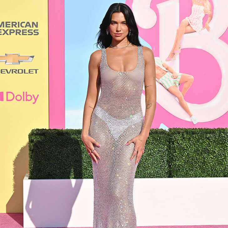 Pop music sensation Dua Lipa certainly knows how to turn heads, and her barely-there Bottega Veneta gown at the ”Barbie” premiere in 2023 was no exception. The crystalline fishnet dress shimmered like stardust, leaving little to the imagination but plenty to discuss. The “Levitating” singer revealed that the daring outfit was a nod to her blue-haired character in the ”Barbie” film, and boy, did she channel her inner Barbie with style.