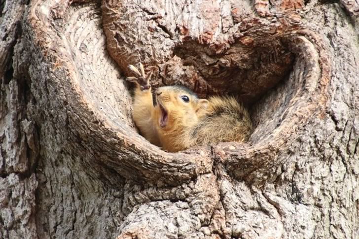 Perched perfectly inside a heart-shaped nook of a tree, this little squirrel appears to be having a dramatic moment—either mid-sneeze, mid-yawn, or mid-rant. With its tiny paw raised like it’s making a bold declaration to the forest, the scene is hilariously theatrical. The natural framing of the bark only adds to the comedy, making the squirrel look like it’s giving a heartfelt monologue on a woodland stage.