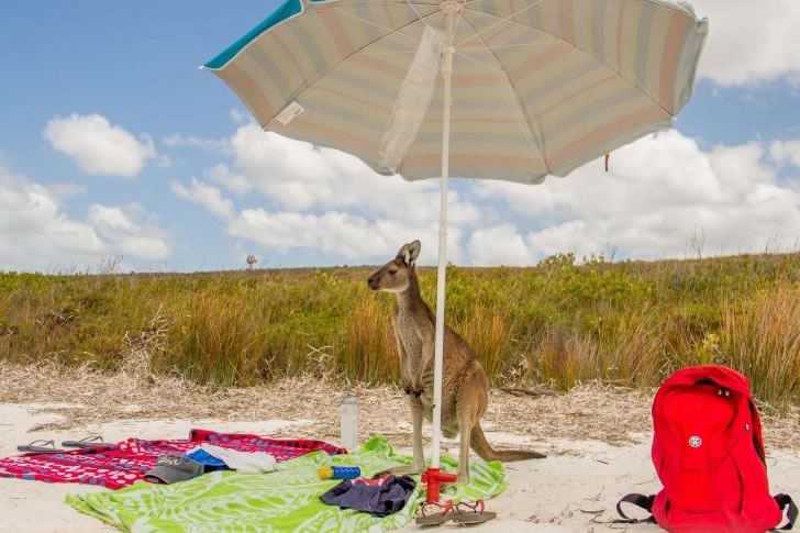 What makes this image even funnier is the juxtaposition of the kangaroo’s natural behavior with the human paraphernalia around it. The animal, with its curious expression, seems perfectly at ease amidst the items typically associated with a day at the beach. The bright umbrella, towels, and even a water bottle seem so out of place yet fitting in this odd setting, creating a humorous contrast that showcases the unpredictability of wildlife. It’s moments like these that remind us how nature can always surprise us with its unexpected charm.