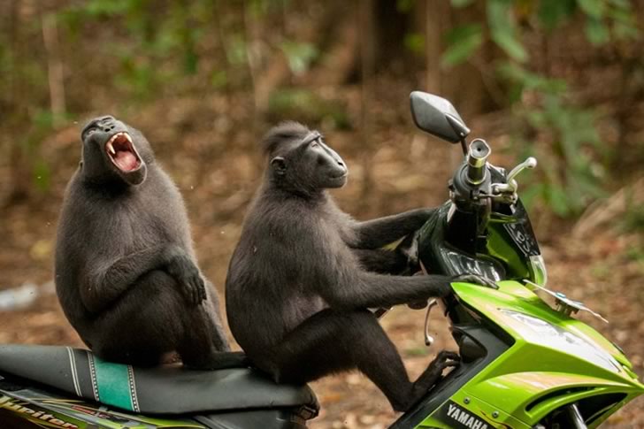 In a hilarious display of curiosity and mischief, two crested black macaques were caught in a scene that looks straight out of a comedy film. One appears to be in the driver’s seat of a bright green Yamaha motorbike, gripping the handlebars with remarkable seriousness, while the other macaque sits behind, mouth wide open in what could easily be mistaken for laughter. The setting is a dense, leafy forest, adding a touch of wilderness to the already absurd image. It’s as if they were plotting a daring escape or just finished the wildest jungle joyride.