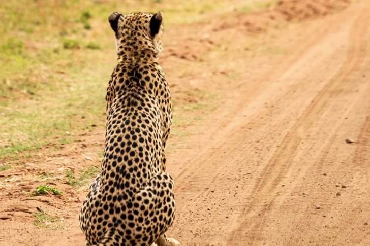 A cheetah sits calmly on a dusty road, facing a speed limit sign reading 40, as if it’s about to be ticketed for its lightning-fast sprints. The spotted feline’s poised posture and the unexpected human-like scenario create a humorous twist, blending the wild with everyday life. The warm, blurred background of grass and bushes adds to the playful absurdity of this moment, making it a delightful surprise.