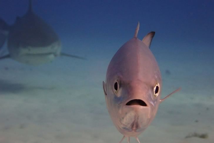 A fish with wide eyes and an open mouth stares straight at the camera, its expression one of pure shock, while a shark looms in the background. The deep blue water and sandy ocean floor create a dramatic scene, amplifying the fish’s comical reaction as if it just spotted its biggest fear, making this underwater moment hilariously relatable.