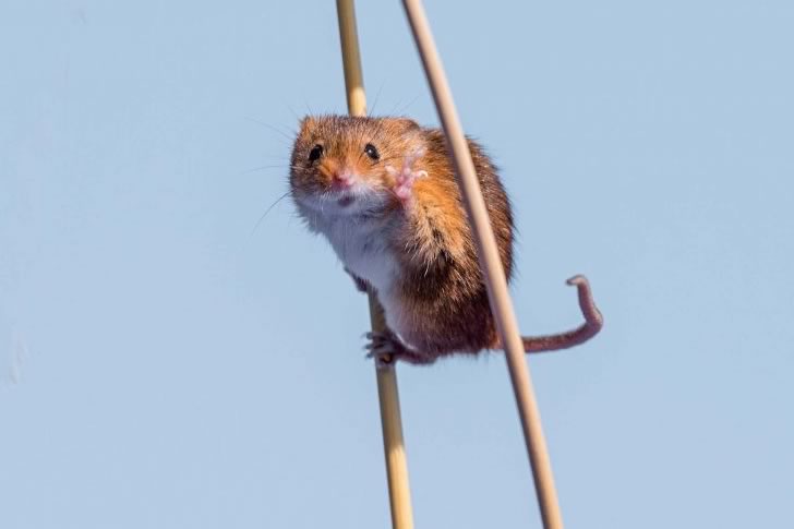 A tiny mouse clings to a slender reed against a clear blue sky, its small body stretched out as if it’s on a daring tightrope walk. With its fluffy fur ruffled by the breeze and a determined look, the mouse appears to be conquering a towering challenge, turning a simple climb into a hilarious feat of bravery.