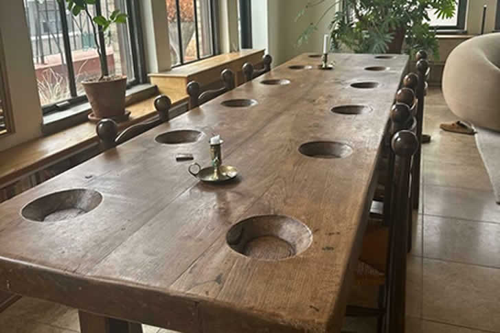 Move over, modern furniture — this giant wooden table from 1893, bought in the Netherlands, comes with 12 built-in bowls. That’s right: no need to pass the salad, just spin and scoop. It’s part dining table, part mystery — were they for soup? Grains? Twelve very organized cats?