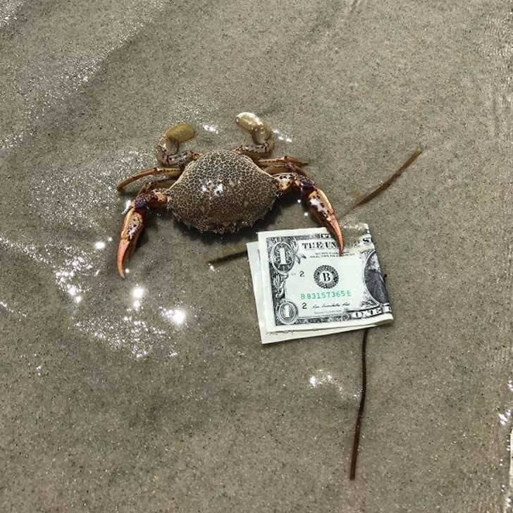There’s a crab holding a wad of cash—or what looks like it—and the whole scene feels like some sort of shady beach deal. Maybe he’s bribing a lifeguard, or maybe he’s trying to buy his way back into the ocean.