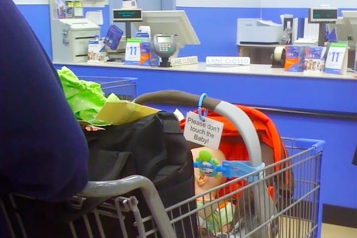 After all, you never know where those hands have been! The sign is both practical and genius, delivering a clear message to well-meaning strangers who might be tempted to pinch a cheek or ruffle some hair. It’s a simple yet effective way to protect the baby’s personal space while the shopping gets done.