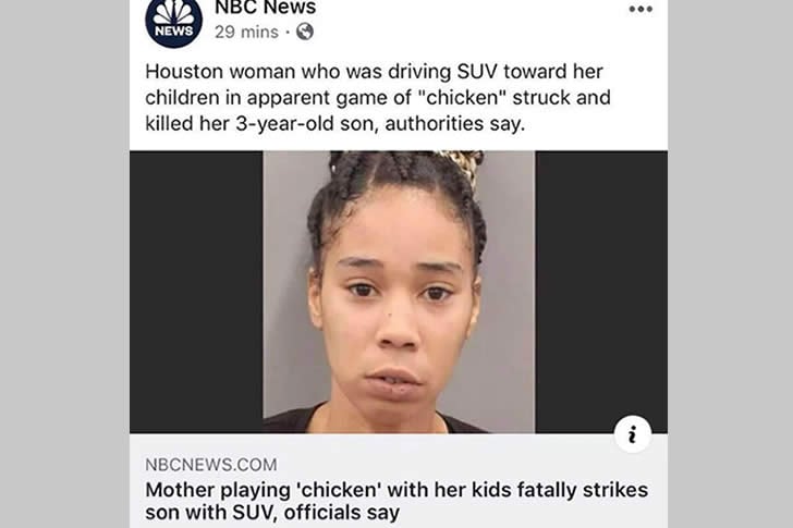 45 Insane Screenshots That Will Leave Any Parent Over 40 Speechless 35. This mom “playing chicken” with her kids and an suv Advertisements Original Post Advertisements PREVNEXT PAGE Top Comment:Why tf would you do that, to anyone, let alone your children? @youcansuckafuck Advertisements PREV NEXT PAGE
